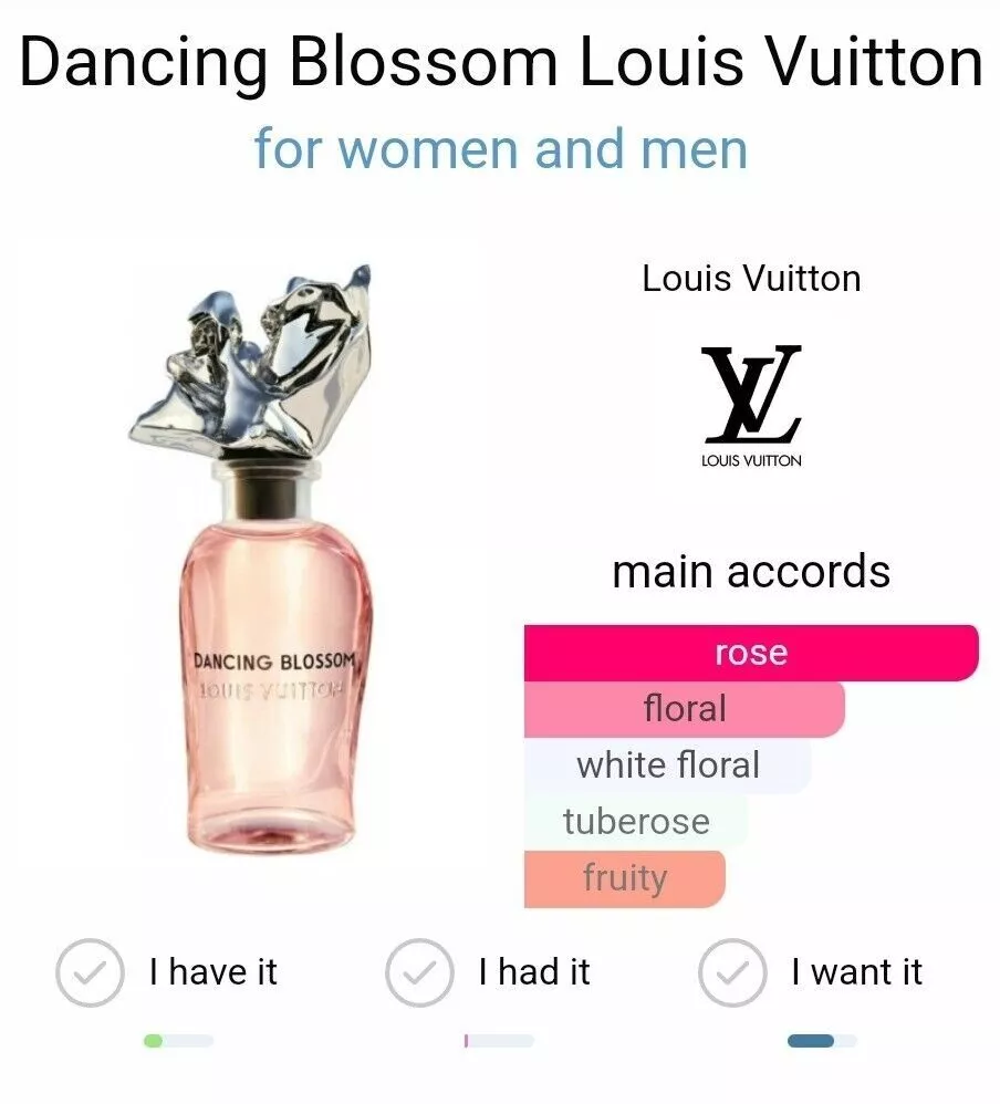 Fragrance Profile: Louis Vuitton Dancing Blossom is a vibrant and elegant fragrance that celebrates the beauty and vitality of blooming flowers. This feminine scent is renowned for its rich, floral, and slightly fruity composition, making it a perfect choice for those who appreciate sophisticated and captivating perfumes.